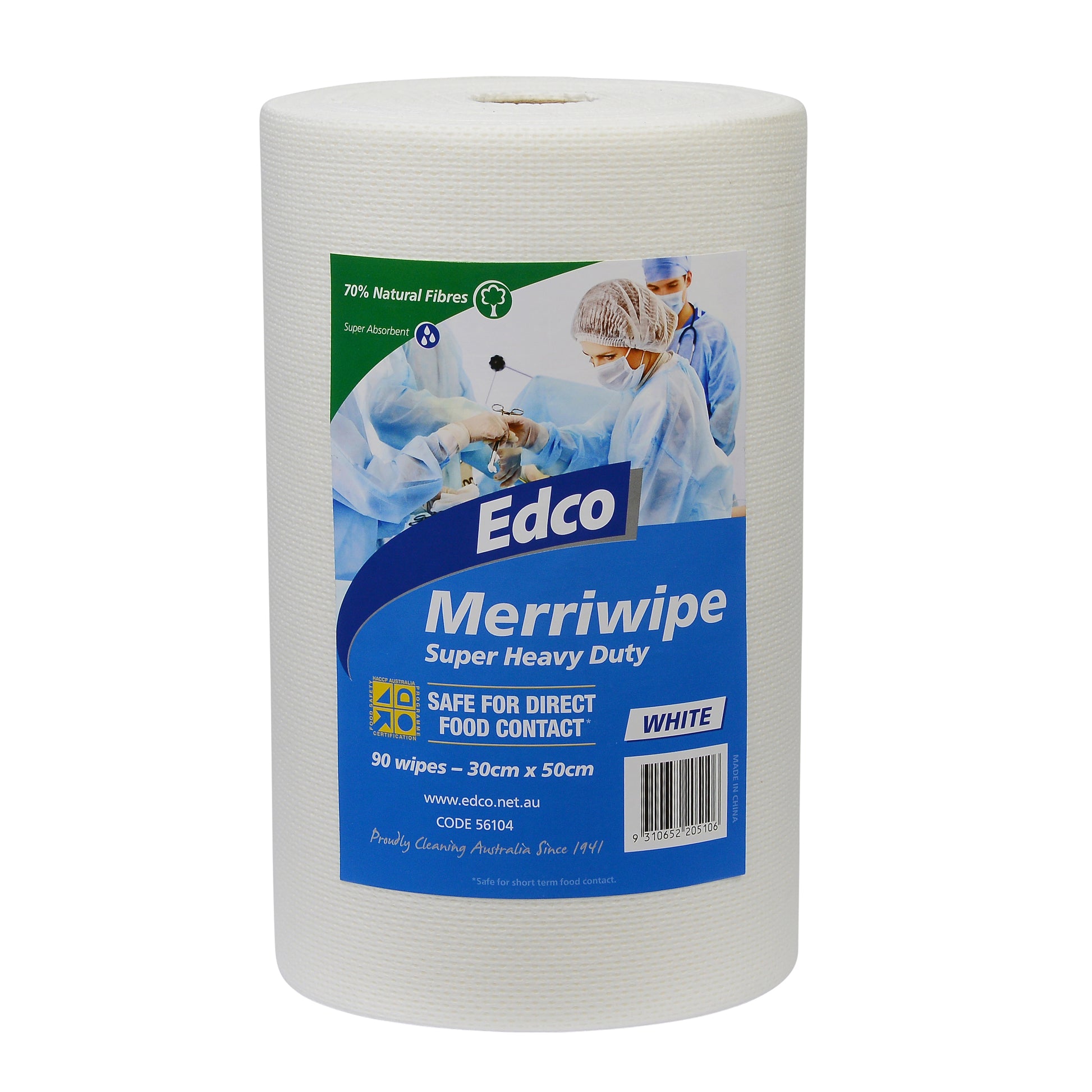 easy tear-off sections. These cloths combine the strength of synthetic fibre with the all natural super absorbent fibres of viscose to make them the most absorbent wipe in our range. The Edco Merriwipe range can be used wet or dry and is a reusable washable product.